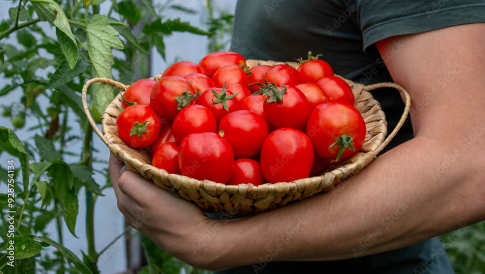 a male farmer holds tomatoes in his hands. Selective focus