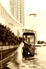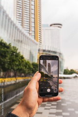 mobile phone in a hand taking a picture if the ICONSIAM mall in Bangkok