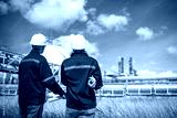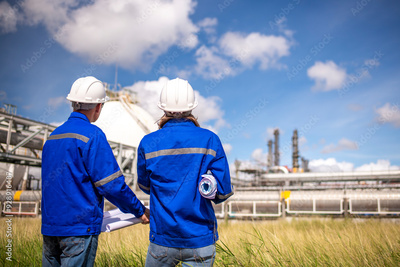 Engineers wearing safety gear, including hard hats examining survey a large blueprint standing industrial facility gas or oil refinery engaged in a job requires high safety standards concept.
