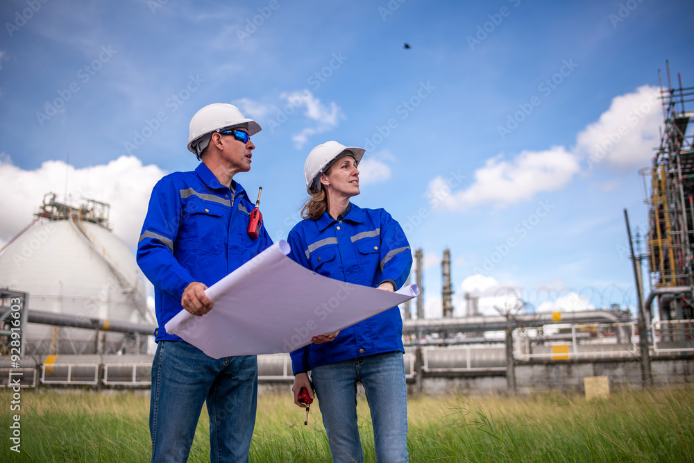 Engineers wearing safety gear, including hard hats examining survey a large blueprint standing industrial facility gas or oil refinery engaged in a job requires high safety standards concept.