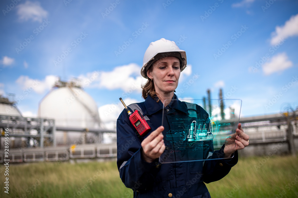 Double exposure show oil refinery process, engineers survey team wear uniform and helmet stand workplace checking tablet work construction site with pipe oil refinery is industry worker concept.