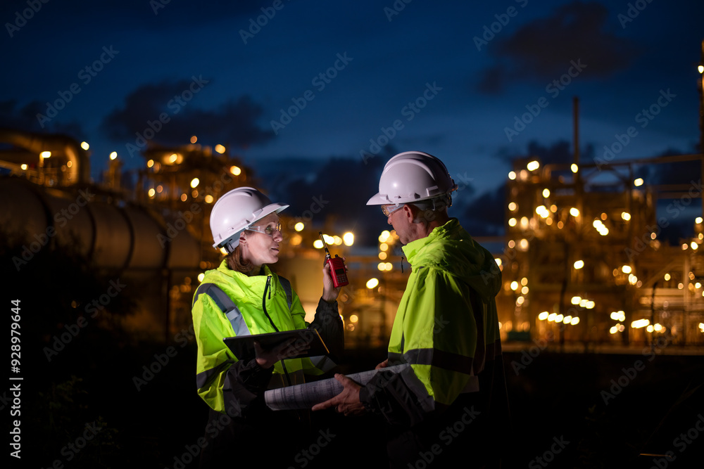 Engineers wear uniform and helmet stand in holding tablet computer , survey inspection work plant site use radio communication to communication with night lights oil refinery background.
