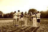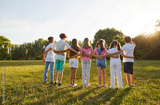Kids huddling in the park in summer. Friends playing together in nature. From behind group children standing in a row on a grass lawn in the morning looking at the sunrise above green trees in the sky