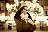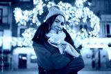 Portrait of cute hispanic woman with crossed-arms in city street on Christmas night