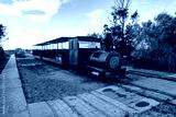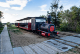 Retro train that transports visitors from the mainland to the Barril beach near Tavira, Portugal.