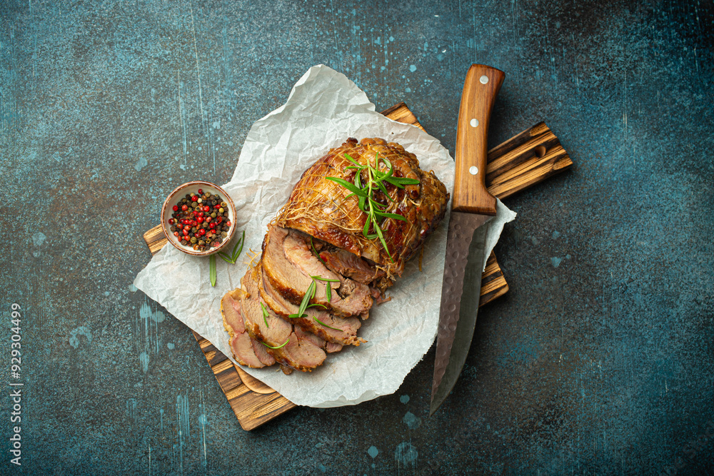 Rolled turkey roasted with spices and herbs on baking paper with knife and rustic concrete background top view. Baked cut for slices turkey fillet roll for dinner.