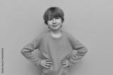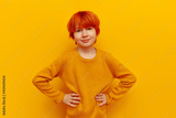 red-haired teenage boy smiling on yellow isolated background, cheerful child with orange hairstyle looking at camera
