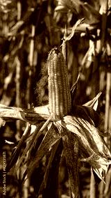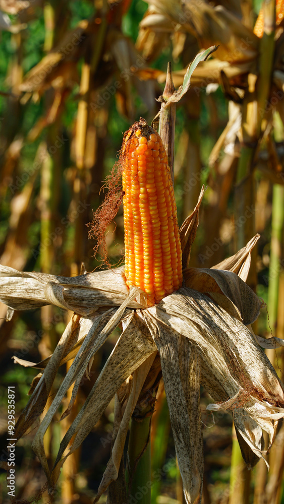 Corn plants on the Cornfield. Corn husks peel off. Focus selected