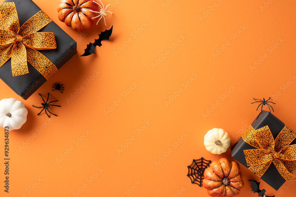 Halloween flat lay scene with pumpkins, gift boxes, bats, and spiders on an orange background