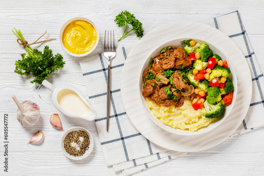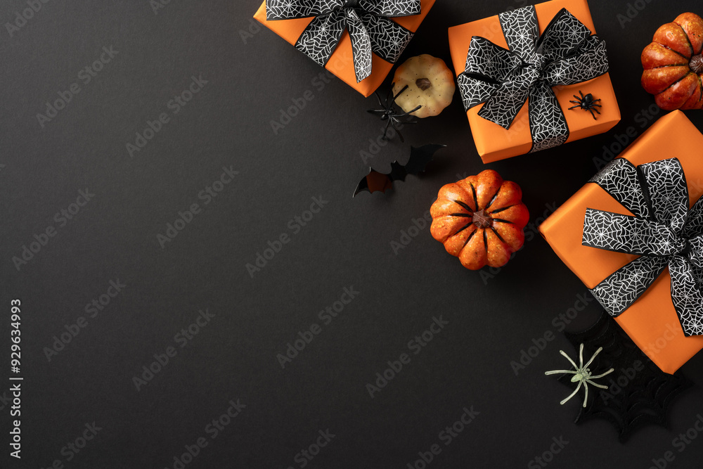 Halloween gift boxes with black ribbons surrounded by pumpkins and spooky decorations on a dark surface