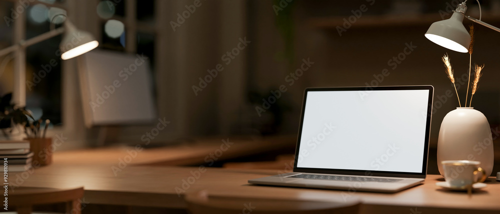 A laptop computer mockup on a wooden table in an office at night, illuminated by table lamps.
