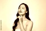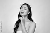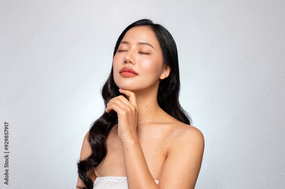 A young Asian beauty poses against a grey background, gently touching her face with her eyes closed.