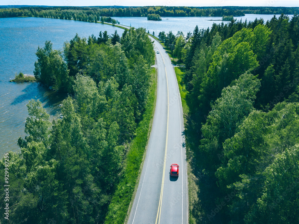 Aerial view of road with cars in green woods by blue lakes sea water in Finland