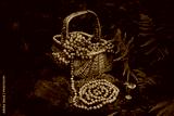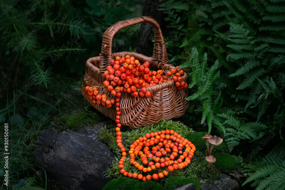 protective rowanberry charm necklace and basket with rowan tree berries in forest. Magic ritual, Witchcraft. Wiccan esoteric practice with handmade beads of rowan berry for protect, positive spirit