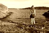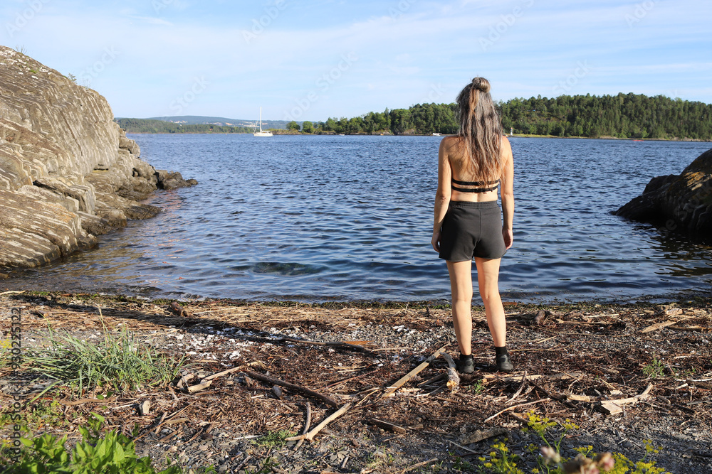 Woman enjoying the view by the lake. Woman in the beach by the fjord in Norway, Oslo.