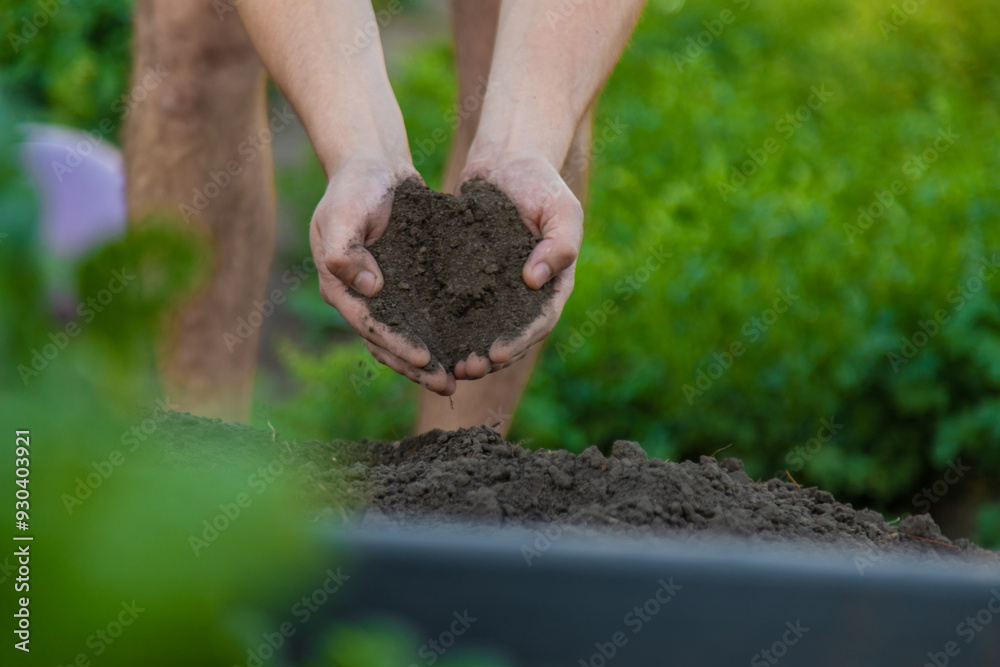 a man holds soil in his hands close-up. Selective focus