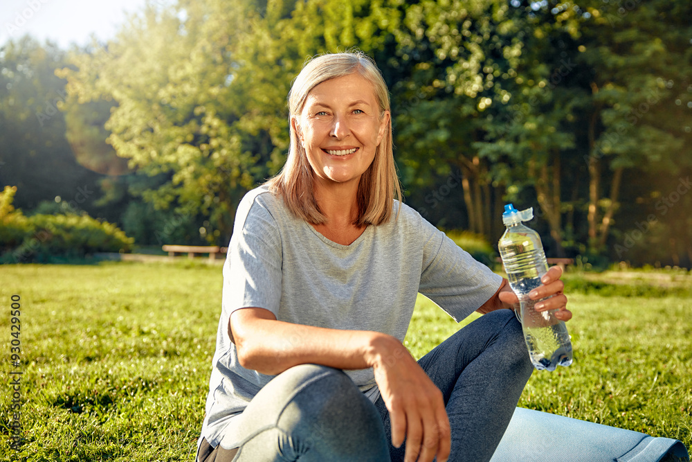 An Active Senior Woman is Enjoying Her Wellness Journey in Nature While Having a Water Bottle