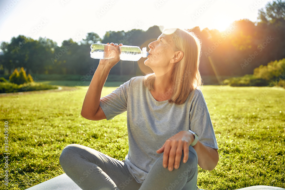 An Active Senior Woman is Enjoying Her Wellness Journey in Nature While Having a Water Bottle