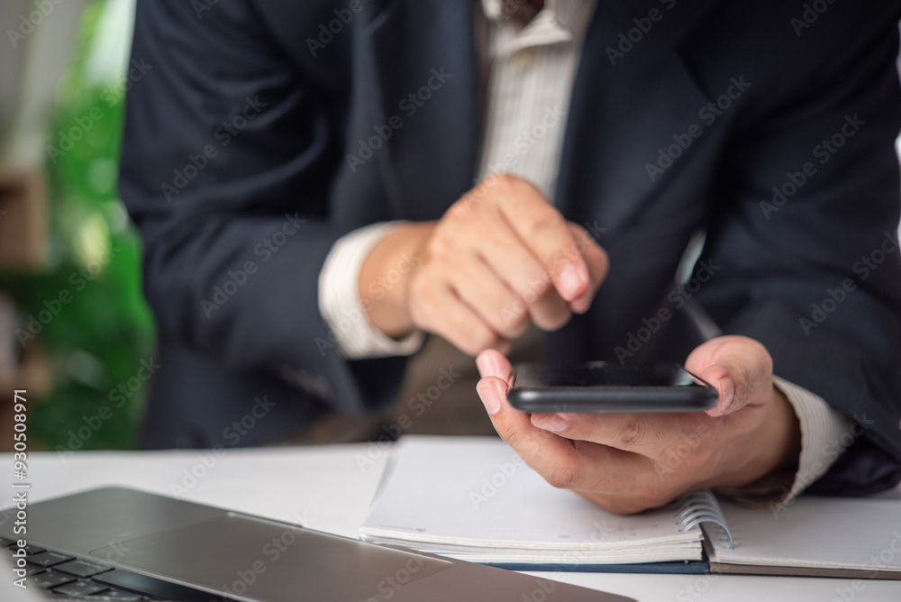 Businessman using a smartphone in an office setting, representing digital finance and communication. Suitable for fintech services, mobile banking apps