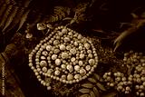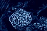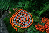 spiral made of snail shells and rowan berries in forest, natural background. Magic ritual, Witchcraft. Wiccan esoteric practice with natural mandala for protect, positive spirit. top view