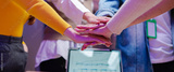Panoramic Teamwork,empathy,partnership and Social connection in business join hand together concept.Hand of diverse people connecting.Power of volunteer charity work, Stack of people hand.