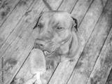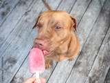 Cute puppy eating delicious ice cream. Top view. Clear, sunny day. Closeup, outdoors. Daylight. Pet care and training concept