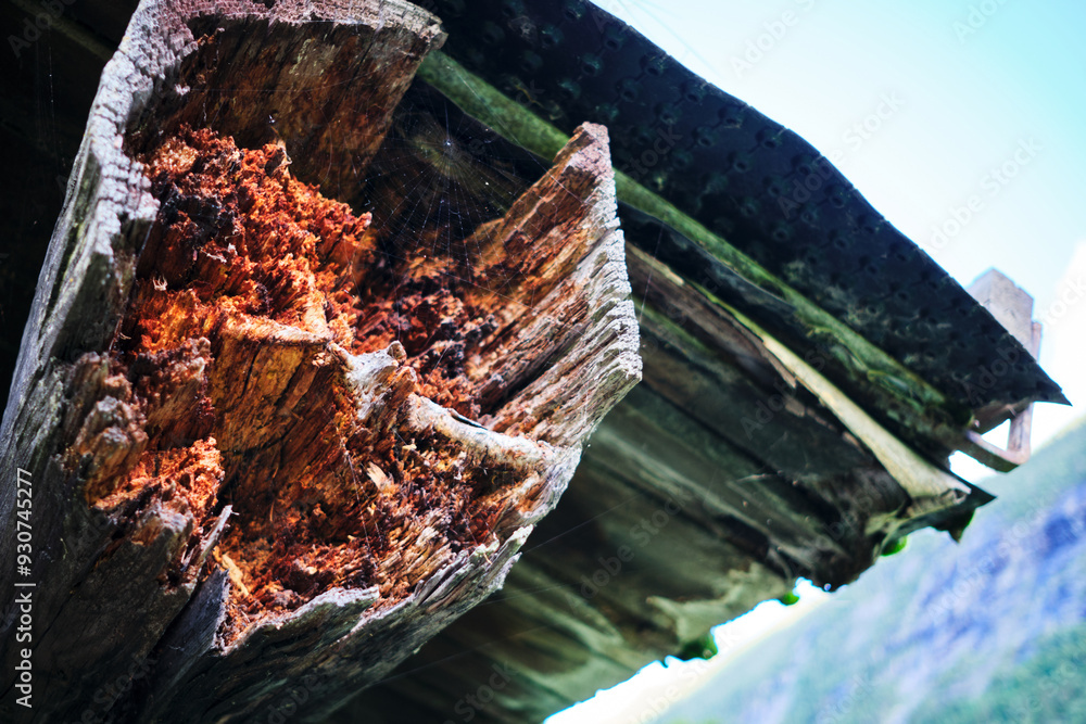 Close-up of decaying wood on an old structure, showcasing the intricate textures and natural wear over time. A glimpse into the effects of nature on historic wooden buildings.