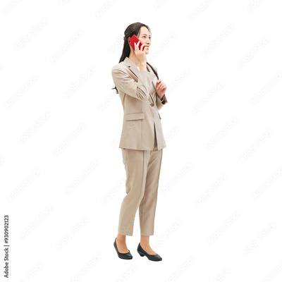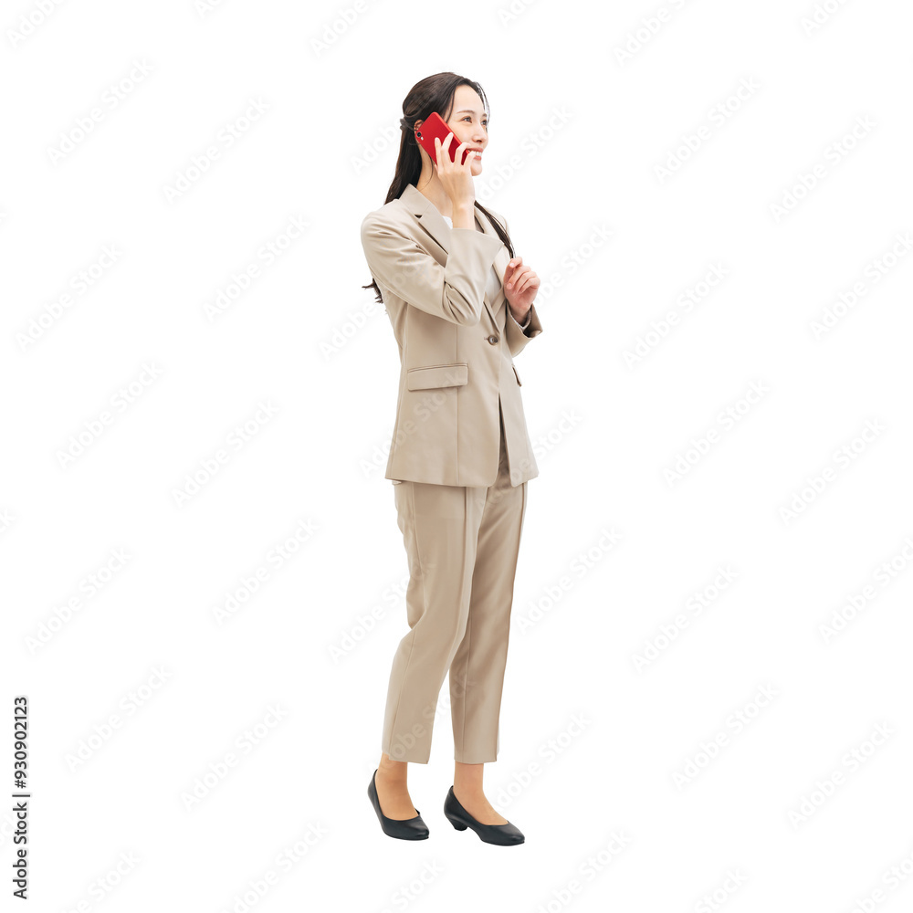 スマホで通話する女性ビジネスパーソン 手作業で精密に切り抜いた背景透過全身写真PNG