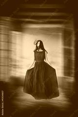 Levitation portrait young woman in house. Astral travel meditation mystical rapture state psychokinesis condition.