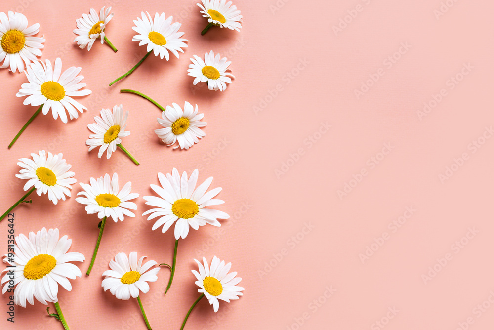 Chamomile daisy flowers and petals on pink background