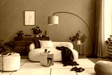 Stylish living room with a curved sofa, modern art, and a large floor lamp. Neutral colors and minimalist design offer a perfect space for relaxation. Template.
