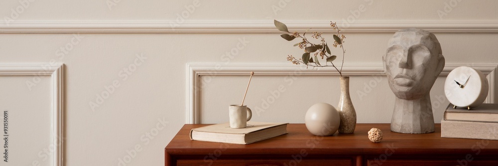 Minimalist composition of living room interior with copy space, wooden sideboard, vase with dried flowers, gray sculpture, books, wall with stucco and personal accessories. Home decor. Template.