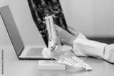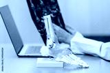A doctor sits at their desk analyzing X-ray images while referencing a detailed model of the ankle joint. Perfect for showcasing diagnostic and treatment planning in orthopedic care.