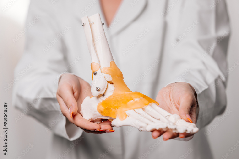 A physician in a white coat presents a detailed foot model, ideal for patient education or professional consultations. Emphasizes orthopedic and anatomical insights.