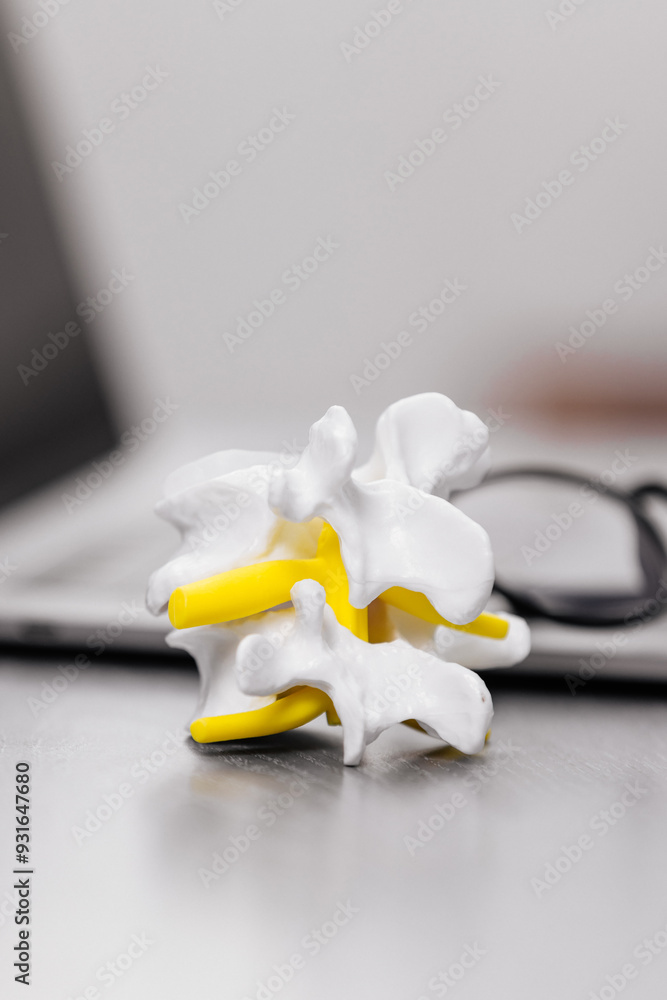 A close-up of spinal models placed on a desk alongside a laptop. Ideal for visualizing the diagnosis, treatment, and therapy of spine-related issues and back pain in a modern medical workspace.