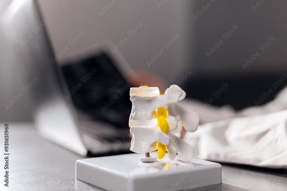 In a contemporary clinic, a physician reviews spine X-rays and anatomical models, noting observations on a laptop. Ideal for showcasing detailed diagnostic analysis and patient assessment.