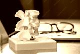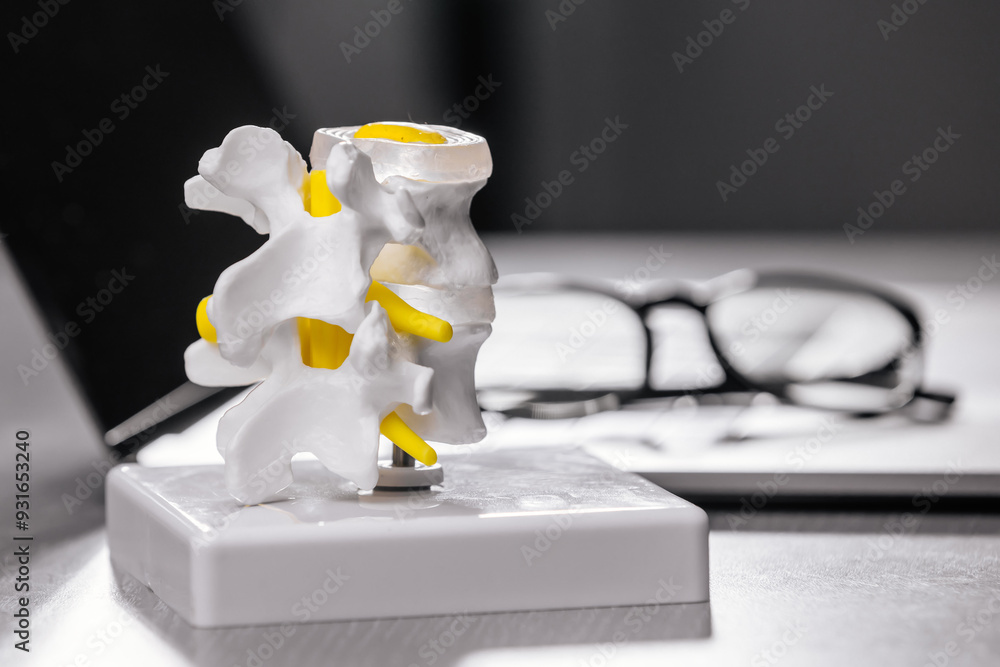 A close-up of spinal models placed on a desk alongside a laptop. Ideal for visualizing the diagnosis, treatment, and therapy of spine-related issues and back pain in a modern medical workspace.