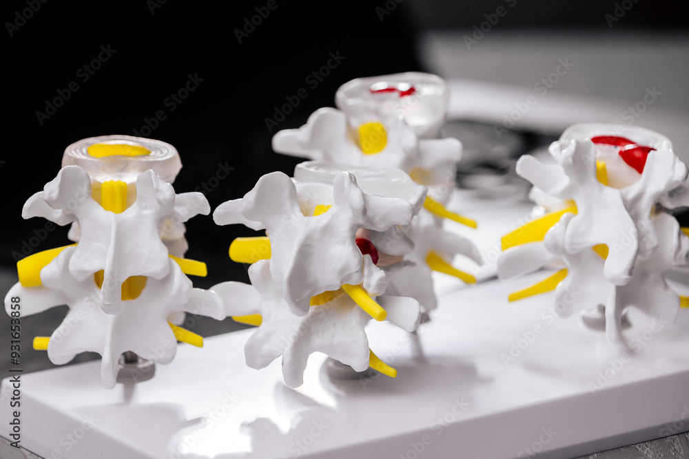 Close-up of a spine model on a physiotherapist's desk, alongside a laptop and glasses. Ideal for depicting spinal treatment procedures and orthopedic care in a modern medical environment.