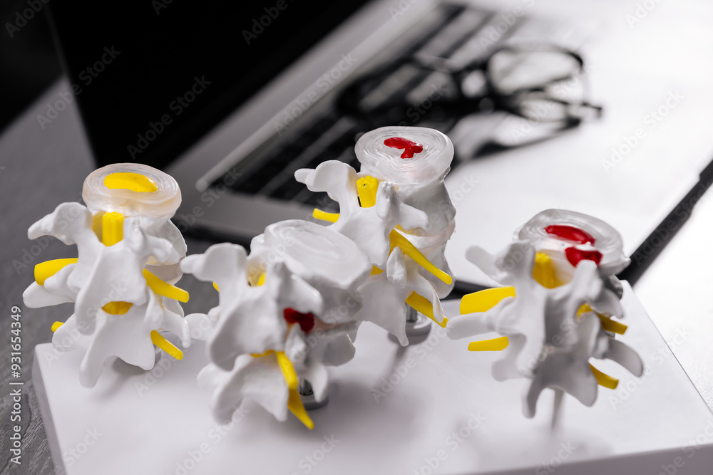 A close-up of spinal models placed on a desk alongside a laptop. Ideal for visualizing the diagnosis, treatment, and therapy of spine-related issues and back pain in a modern medical workspace.