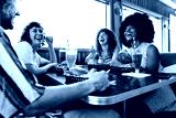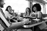 Multiethnic group of friends having meal at 80s vintage diner restaurant - Multiracial young people bonding and having fun, eating in an american fast food burger house