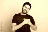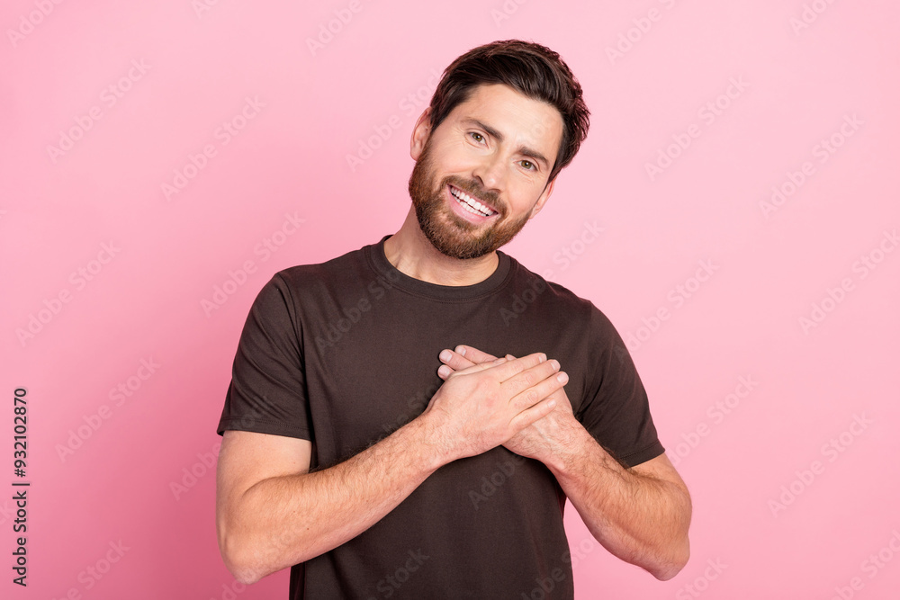 Photo of thankful grateful guy with stubble brunet hair dressed brown t-shirt hold arms on chest isolated on pink color background