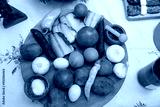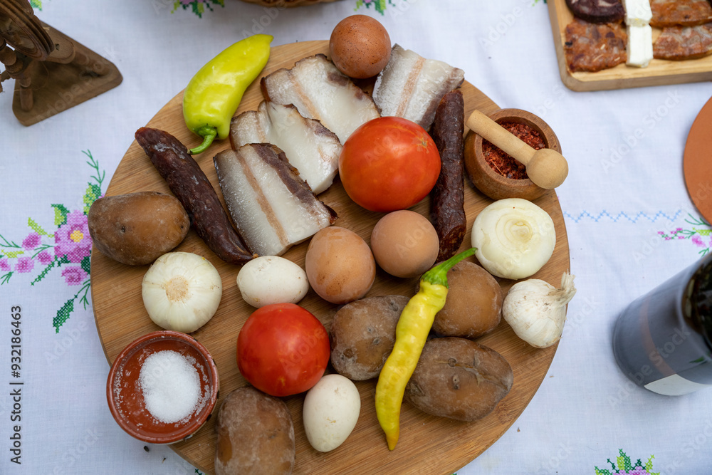 Balkan food bacon, onions, tomatoes, sausages and boiled eggs