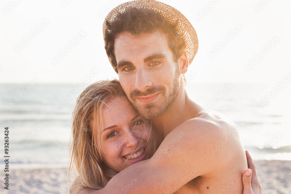 Sunset, sandy beach, a couple of lovers embracing on the deserted beach at sunset during a day at the beach on vacation. First the couple, in the background the sea