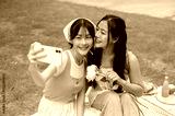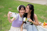 Two lovely young Asian women take a selfie with a smartphone while picnicking together in a park.