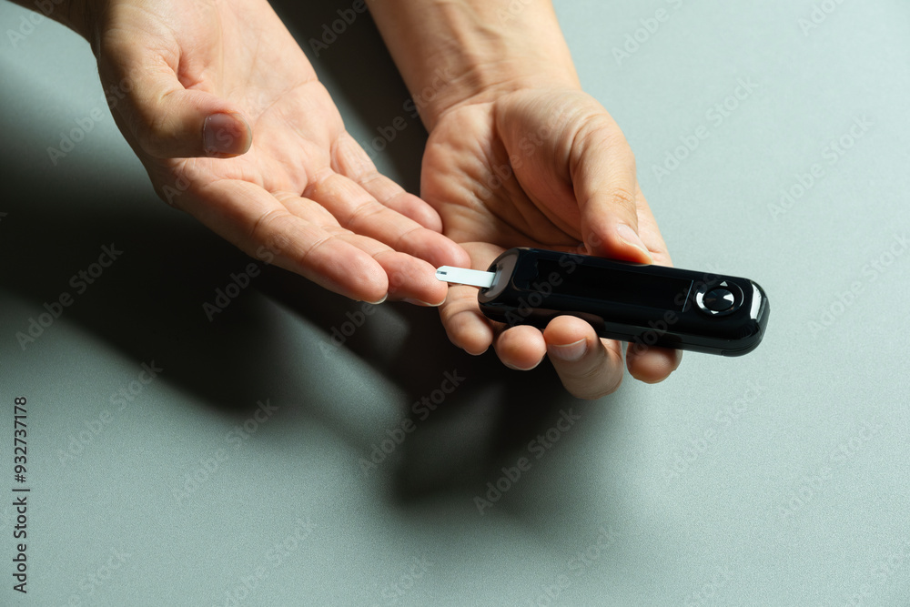 hand of people check diabetes and high blood glucose monitor with digital pressure gauge. Healthcare and Medical concept