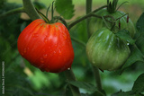 Beefsteak red ripe tomato with water drops in the vegetable garden on summer
