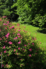 Pink japanese Spirea or Spiraea flower in the garden on springtime. Spirea japonica on a sunny day