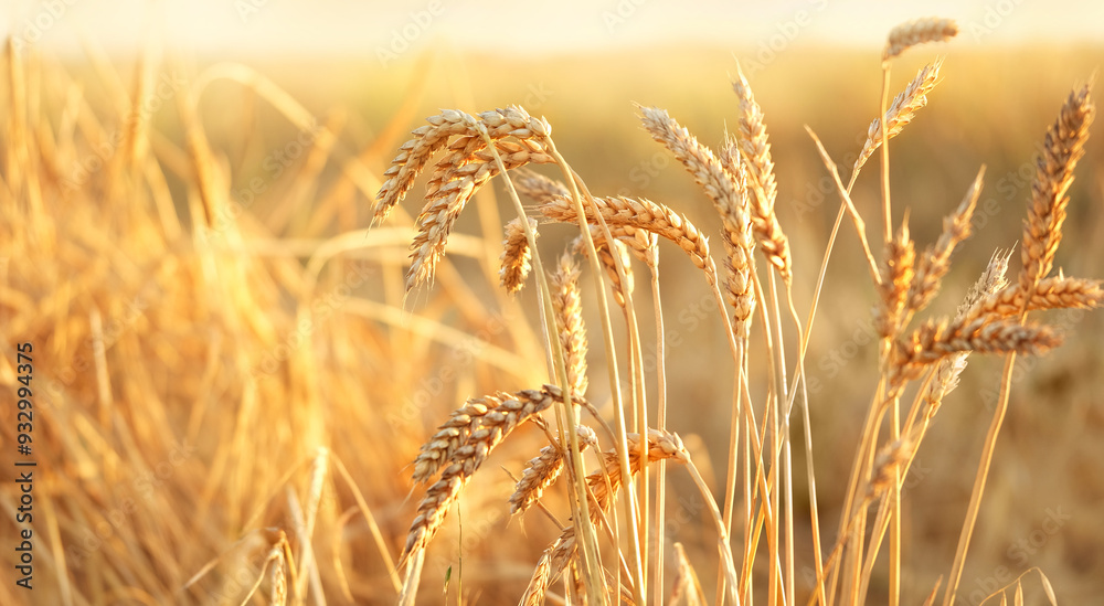 ripe ears of wheat close up on field, abstract natural background. summer or autumn harvest season. agriculture concept. rustic landscape. symbol of grain harvest, Lammas, Lughnasadh holidays