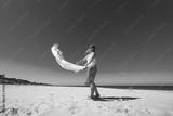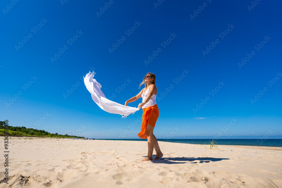 Beach vacation. Young pretty woman wearing white one piece swimsuit and orange sarong shaking beach towel on beautiful sandy beach against blue sky on summer day.