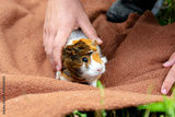 A boy plays in the park with a fluffy brown and white guinea pig.